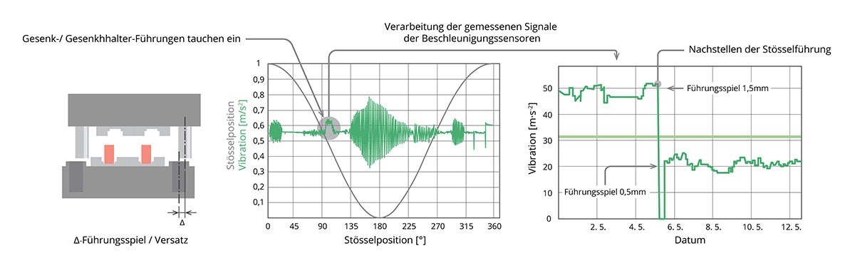 Eine Reihe von Maschinenparametern, wie zum Beispiel Stößel-Führungsspiel oder Zustand von Tisch- und Stößeloberflächen sowie die Oberflächen der Gesenkhalter können nur während eines kompletten Maschinenstillstands überprüft werden. Bei Unkenntnis dieser Parameter werden unter Umständen Qualitätseinbußen der Schmiedestücke hingenommen oder können anfänglich kleine Abweichungen zu größeren Schäden an Maschine und Gesenkhalter führen. Dies kann durch eine Echtzeitüberwachung dieser Parameter vermieden werden. Zur Überwachung werden entsprechende Sensoren eingesetzt. Gab es solche Installationen auch schon in der jüngeren Vergangenheit, so kommt der Übermittlung, Speicherung und vor allem der Analyse der dabei entstehenden Datenmengen die größere Rolle zu.