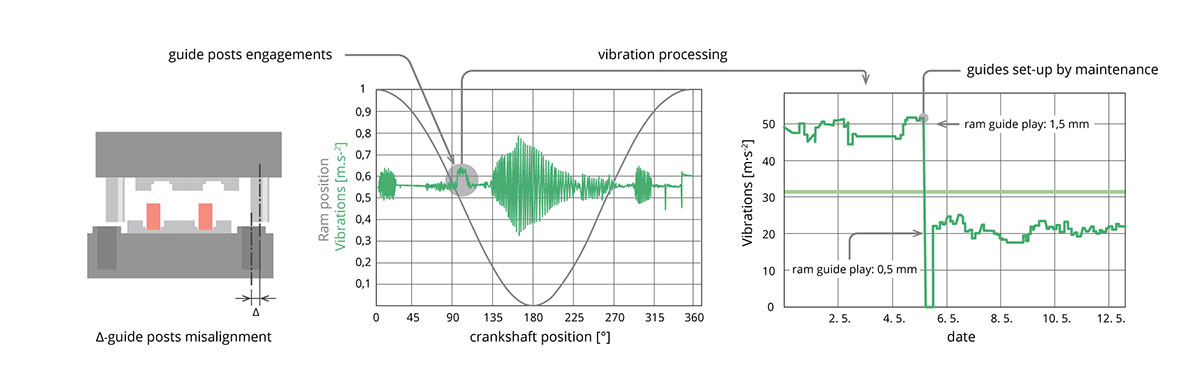 Several machine parameters, for example, the guide clearance or the planarity of the bed and ram surfaces or the degree of wear on the bolster surface can only be checked during downtime of the machine. If these parameters are not known a reduced quality of the forgings may have to be accepted or initially small signs of wear and tear may lead to major and expensive damage on the bolster and the machine. Real-time monitoring of these parameters, however, leads to an early detection of abnormal conditions. Various sensors are used for this task. These sensors are not new in principle, but the amount of data they produce needs to be transmitted, stored and analyzed which has only become possible with modern technology, both hardware and software.
